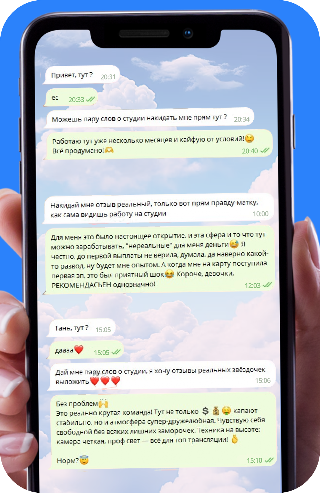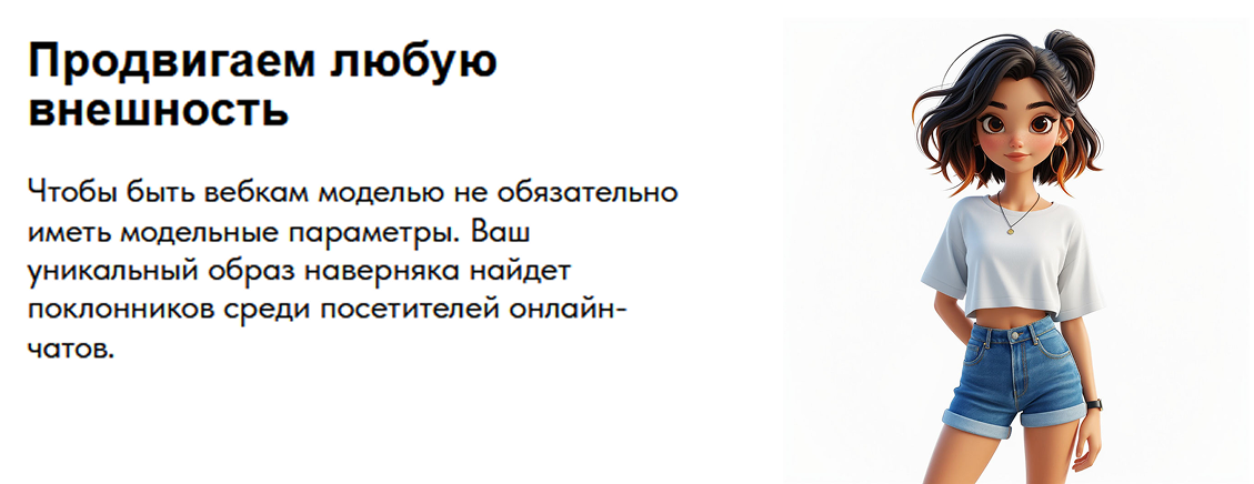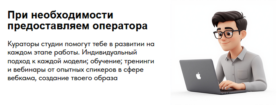 Личный куратор от студии полностью ведет вашу работу на вебкам сайтах. Он полностью продумывает образ модели, помогает с его реализацией и ведет переписки на вебкам сайтах, во время твоего обучения.