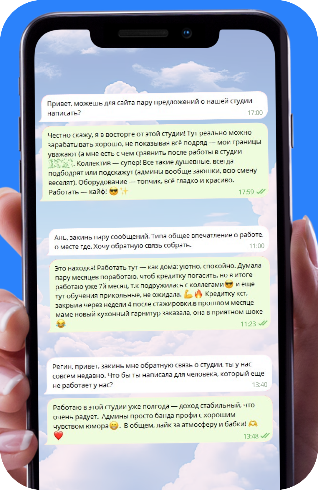 Ты сама распоряжаешься своим временем. Можешь работать в удобном для тебя режиме УТРОМ, ДНЁМ, ВЕЧЕРОМ. Студия открыта для тебя 24/7.